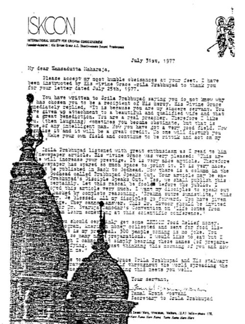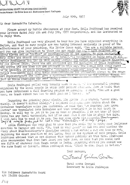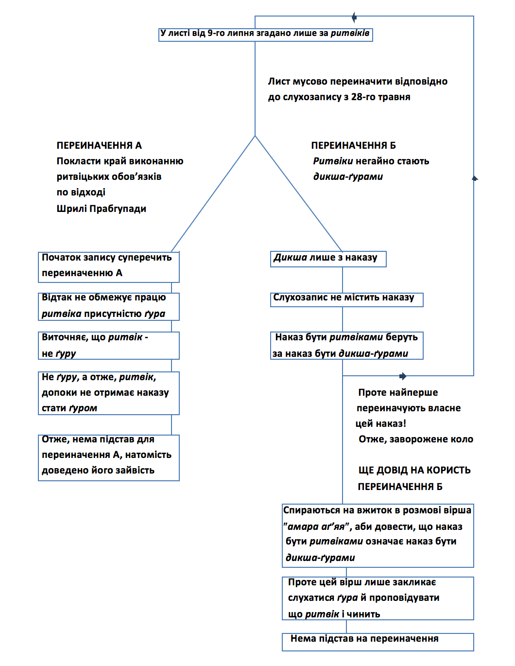 Прабгупада показав, що то можуть бути не лише саньясини. Він найменував двох осіб-ґригастгів, спроможних ритвікувати, чим показав, що вони не гірші за будь-якого саньясина. Будь-хто духово дотепний тямить, що не можна брати учнів за присутности свого духового вчителя, прецінь по відході ґура це дозволено за умови вправности й віри здогадного учня у свого вчителя. Звісно, вони (учні) мають знати, як визначити гідного ґура. Отже, бувши вправним, вільно взяти учня по відході свого ґура. Це мов здатність людини до розплодження. (...) На жаль, Уповноважений виділ того не визнає. Вони зараз вирішили, що ці одинацятеро є вибраними ґурами. Я достеменно відомий за себе, що намагався певним чином орудувати, за що покірно благаю всіх мені вибачити. Така є зумовлена вдача, що розпукується за обіймання найвищої посади: "Ґуру - це чудово! Тепер я - ґуру, й нас лише одинацятеро". (...) Відчуваю, що нам залежить на такім справдженні, чи то пак розумінні, якщо ми збираємось надалі уникнути чогось подібного, бо, повірте, воно повториться. За певного часу прикрість ніби зникає, прецінь небавом знову щось трапляється, незалежно від місцеперебування, чи то в Янголові, чи то будь-де. Це триває, допоки ти не дозволиш беззастережно проявитися щирому духовому впливові Кришни. (...) Вважаю що Уповноважений виділ має хутчій визнати цю точку зору, їм слід усвідомити ту правду, що вони не можуть надати жодних звукозаписів чи листів, де б Прабгупада стверджував: "Я приділяю цих одинацятьох за ґурів". Таких доказів не існує, бо він ніколи нікого не приділяв за ґура. Це байка. (...) Від дня вашого висвячення ви маєте право стати батьком, як той піде в засвіти, за умови, що ви вправні. І жодного обрання. Воно не потрібне, адже ґура не обирають.