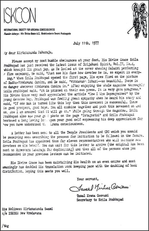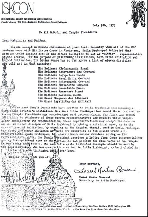 Шриля Прабгупада відповів: "Гаразд, я наставлю таких...", і зачав називати ймення. (…) Він виразно розтлумачив, що всі висвячені є його учні. Тоді я добре втямив, що вони його учні. Згодом я запитав його за дві речі, перша: "Як щодо Брагмананди Свамія?" Я спитав, бо ми з Брагманандою були приятелі. (...) Тому Шриля Прабгупада відповів: "Ні, хай набуде більшої вправности". Перед друкуванням листа я спитав за друге: "Шриле Прабгупадо, це всі, чи бажаєте ще кого долучити?" Він відповів: "За потреби запевне буде долучено ще". Зараз мені дійшло, що він учинив дуже мудро. Він був не на силі здійснити службовий обряд тілесного висвячення, тому наставив одинацятьох обрядарів-священиків на виконання цього обряду від його імени. Він приділив одинацятьох і виразно промовив: "Хай висвячує будь-хто найближчий". Ці слова мають велику вагу, бо справжнє висвячення означає не найближчого священика, а такого, що його прагне твоє серце. Висвячення отримуєш у того, кому віриш. Що ж до відправлення обряду, то звертаються до найближчого, і Шриля Прабгупада наголосив на цьому. Він назвав імена обрядарів. Ці обрядарі перебували в різних куточках світу, і Шриля Прабгупада сказав: "Зверніться до особи, найближчої до вас, і вона перевірить ваш рівень. Відтак ця особа висвятить вас від мого імени".