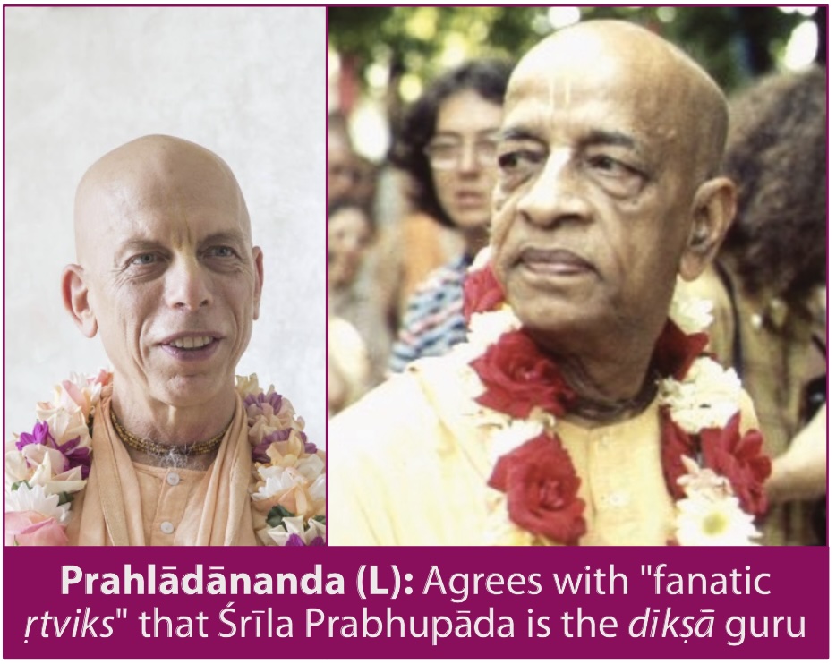 n our landmark book, Srila Prabhupada: The Founder-Acarya of ISKCON – Presenting the Conclusions of the GBC Foundational Document, we established that the GBC accepted (unwittingly) that Srila Prabhupada's position as the Acarya of ISKCON means he is also ISKCON's diksa guru. One evidence the GBC used to establish this conclusion was the purport to Sri Caitanya-caritamrta, Adi-lila, 1.46, wherein Srila Prabhupada describes the Acarya as the diksa guru. GBC voted-in guru HH Prahladananda Swami ("PAS") gave a class on the same verse (and surrounding verses) on 1/9/24, to claim that the Acarya is not also the diksa guru, titling his class: "Difference between an acarya and initiating spiritual master". The quotes in the shaded boxes are from this class.